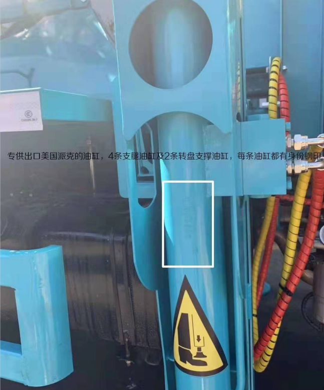 4、液壓支腿,H型液壓支腿加前液壓支腿 ,二節水平支腿跨距大,穩定性好,可同時或單獨操作,前支腿加強了車輛的穩定性